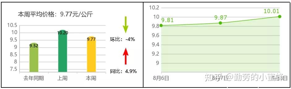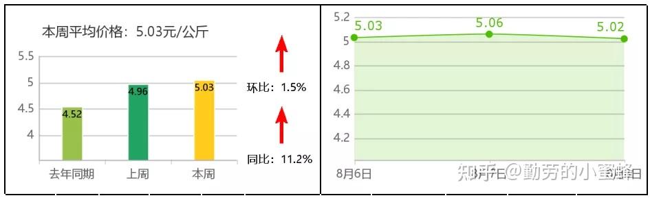 从具体价格来看,与上周相比,下降幅度最大(-2.3%)的韭菜本周(2021年8月6日~8月13日)平均价格为4.08元/公斤;与去年同期相比,变化幅度相对较大的韭菜(15.0%)、豆角(35.4%)本周平均价格分别为4.08元/公斤、6.54元/公斤。