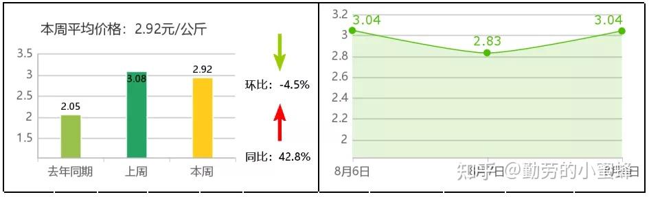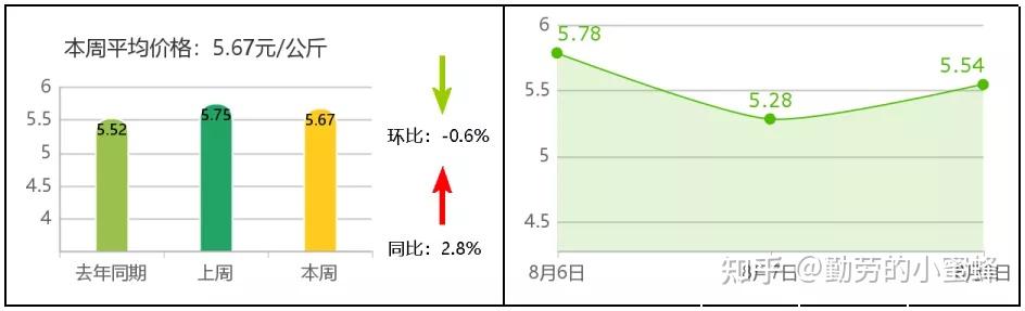 从具体价格来看,与上周相比,上涨幅度最大(17.1%)的大白菜本周(2021年8月6日~8月13日)平均价格为2.05元/公斤;与去年同期相比,变化幅度相对较大的洋白菜(-13.0%)、茄子(20.4%)本周平均价格分别为1.84元/公斤、3.72元/公斤。