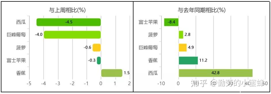 重点监测的5种水果(富士苹果、巨峰葡萄、香蕉、菠萝、西瓜),与上周相比,变化幅度在-4.5%~1.5%之间,其中,西瓜、香蕉波动相对较大;与去年同期相比,变化幅度在-8.4%~42.8%之间,其中,富士苹果、西瓜变化幅度相对较大。