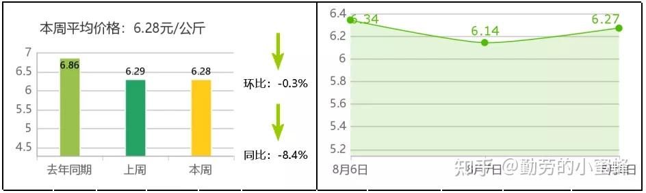 2021年第32周,全国农产品批发市场富士苹果平均价格为6.28元/公斤,与上周相比,下降了0.3%;与去年同期相比,下降了8.4%;从每日监测数据来看,2021年8月6日~8月13日,富士苹果平均价格从6.34元/公斤波动至6.27元/公斤,峰值为8月6日的6.34元/公斤,谷值为8月7日的6.14元/公斤。