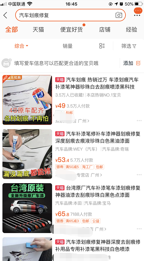我问了一下,去修复一次刮痕要花多少钱?他和我说的是一个面400,两个面800;还说这只是在修车店,要是在4S店至少得花一两千还是有点小贵!后来我就想到了这个汽车划痕修复神器货源网去某宝一看,卖的便宜多了,销量还特别高,都是几万的销量!。